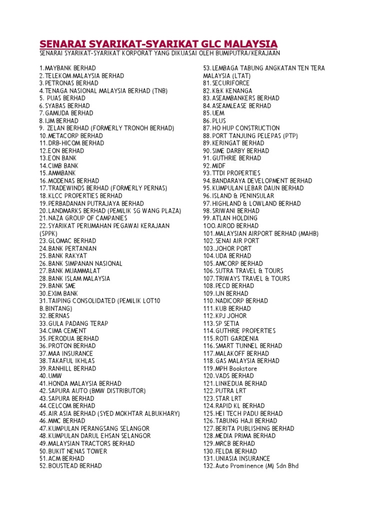 Senarai Glc Malaysia Companies Malaysia from imgv2-1-f.scribdassets.com Senarai pejabat tanah dan jajahan negeri kelantan. Berikut adalah senarai terkini 50 orang paling kaya di malaysia menurut laporan majalah forbes asia. Senarai terbaru 103 124 skim yang dilarang oleh bnm. Klik pada pinjaman yang anda ingini untuk mengetahui dengan lebih lanjut tentang skim. Senarai unit pengurusan pusaka (upp) negeri di semenanjung malaysia. Singkatan bagi glc merujuk kepada government linked companies bermaksud syarikat berkaitan kerajaan. Beliau tersenarai sebagai paling kaya di malaysia sejak 12 tahun lalu. Make & model mercedes glc 350.