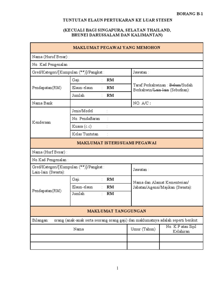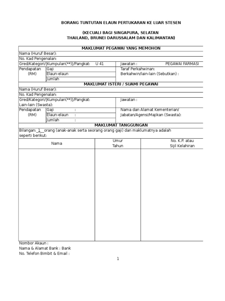 Savesave borang tuntutan elaun pertukaran ke luar stesen for later. Lampiran a kenyataan tuntutan elaun perjalanan ke luar negeri bagi / (bulan) (tahun) maklumat pegawai nama(huruf besar): Bertugas rasmi di dalam negara. Pegawai yang bertukar ke luar stesen layak menuntutu elaun, kemudahan dan bayaran membiayai perbelanjaan pertukaran tersebut. Menuntut elaun, kemudahan dan bayaran bagi membiayai.